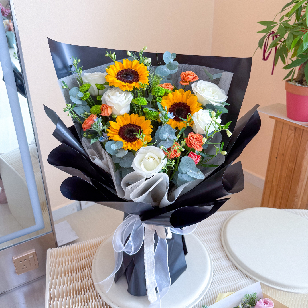 • Flower included: Sunflower (3 stalks), Rose White ( 5 stalks), filled with spray rose, pom pom green, oxypetalum blue, seasonal flower and foliage