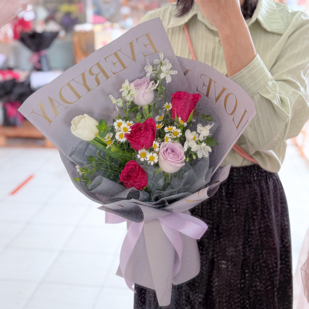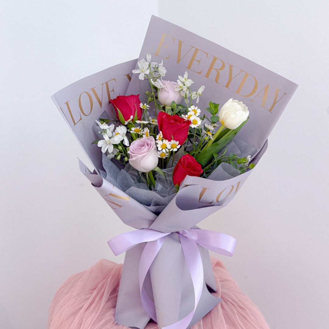 • Flower included: Rose Red (3 stalks), Rose Lilac (2 stalks), Tulip White (1stalk), filled with mini delphinium and chamomile