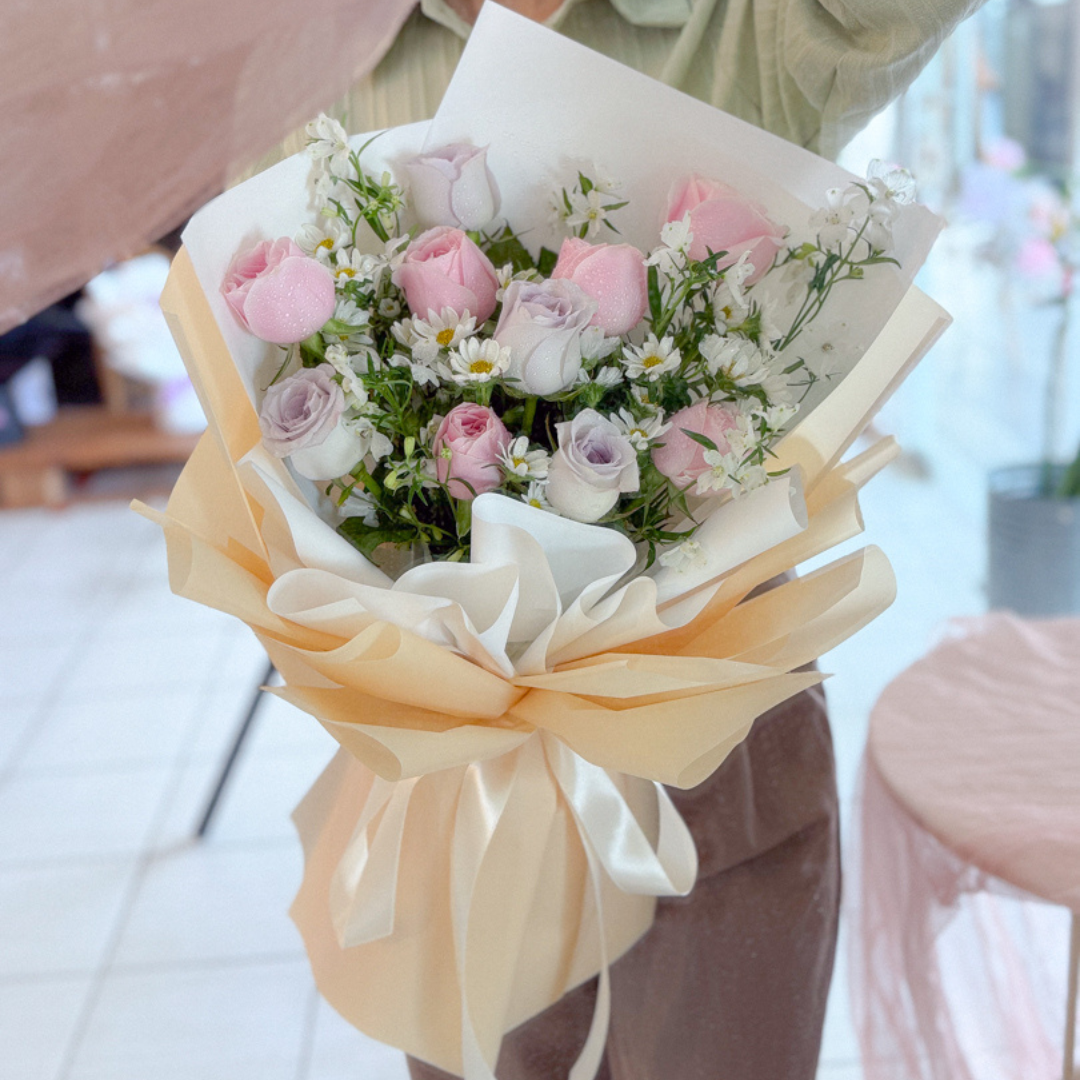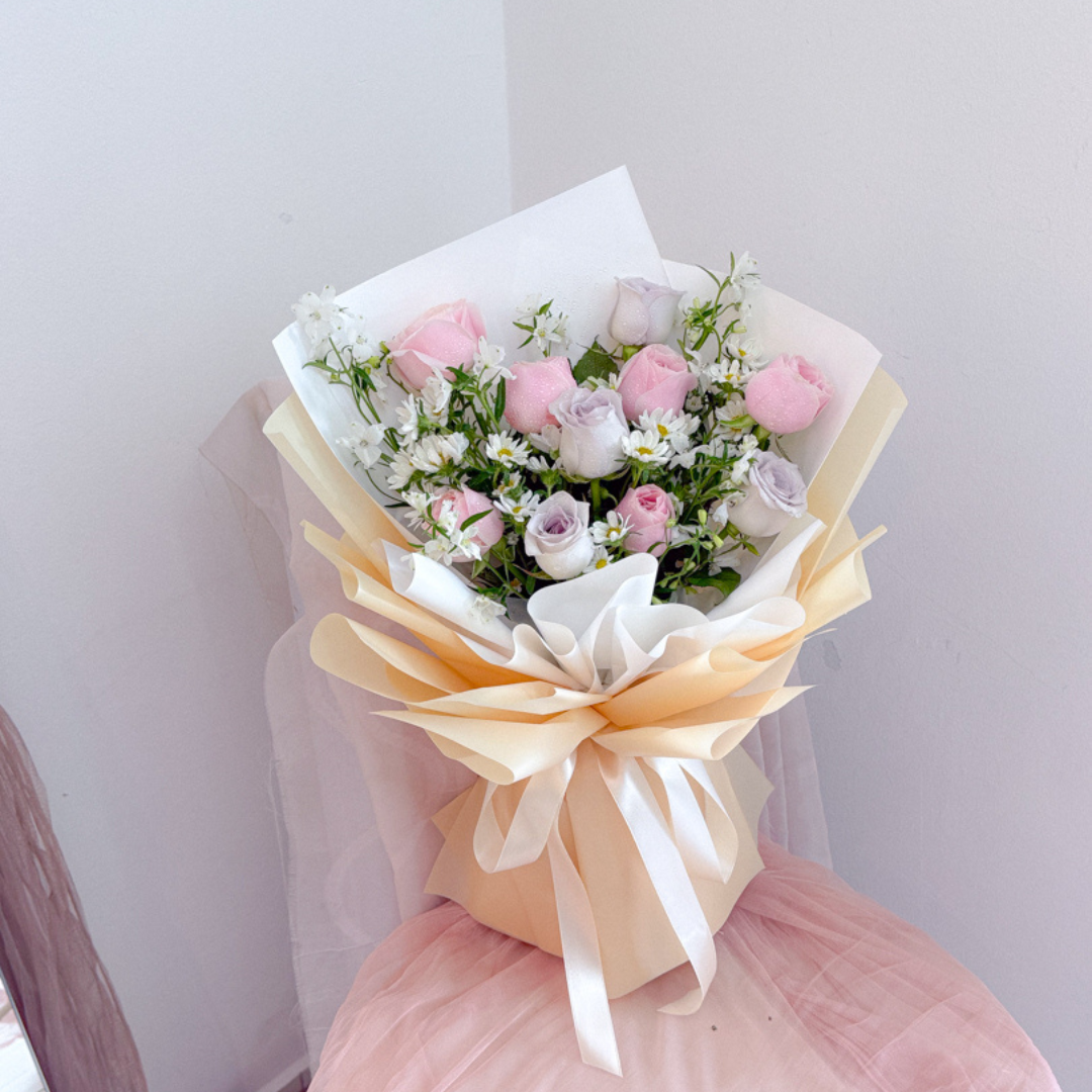 - Flower included: Rose Lilac (4 stalks), Rose Pink ( 6 stalks), filled with chamomile and oxypetalum white.
