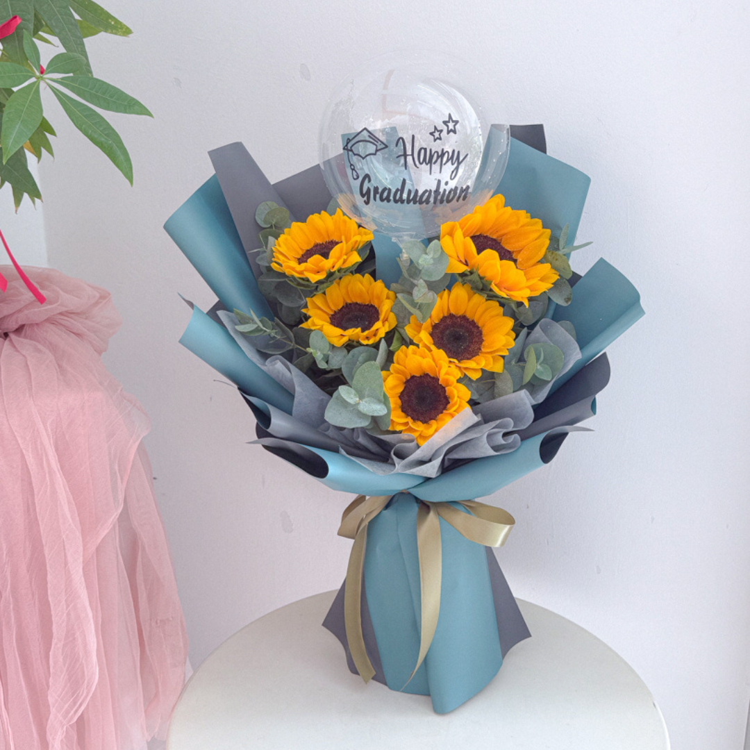 - Flower included: Sunflower (5 stalks) filled with cinera. Come with a 15cm Balloon. Wording can choose.