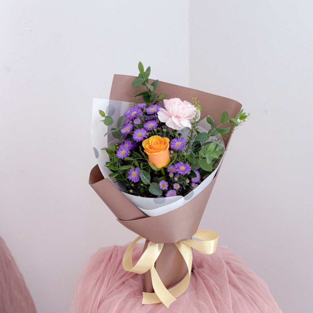 - Flower included: Rose Orange (1 stalk), Carnation Pink (1 stalk), filled with peacock purple and foliage