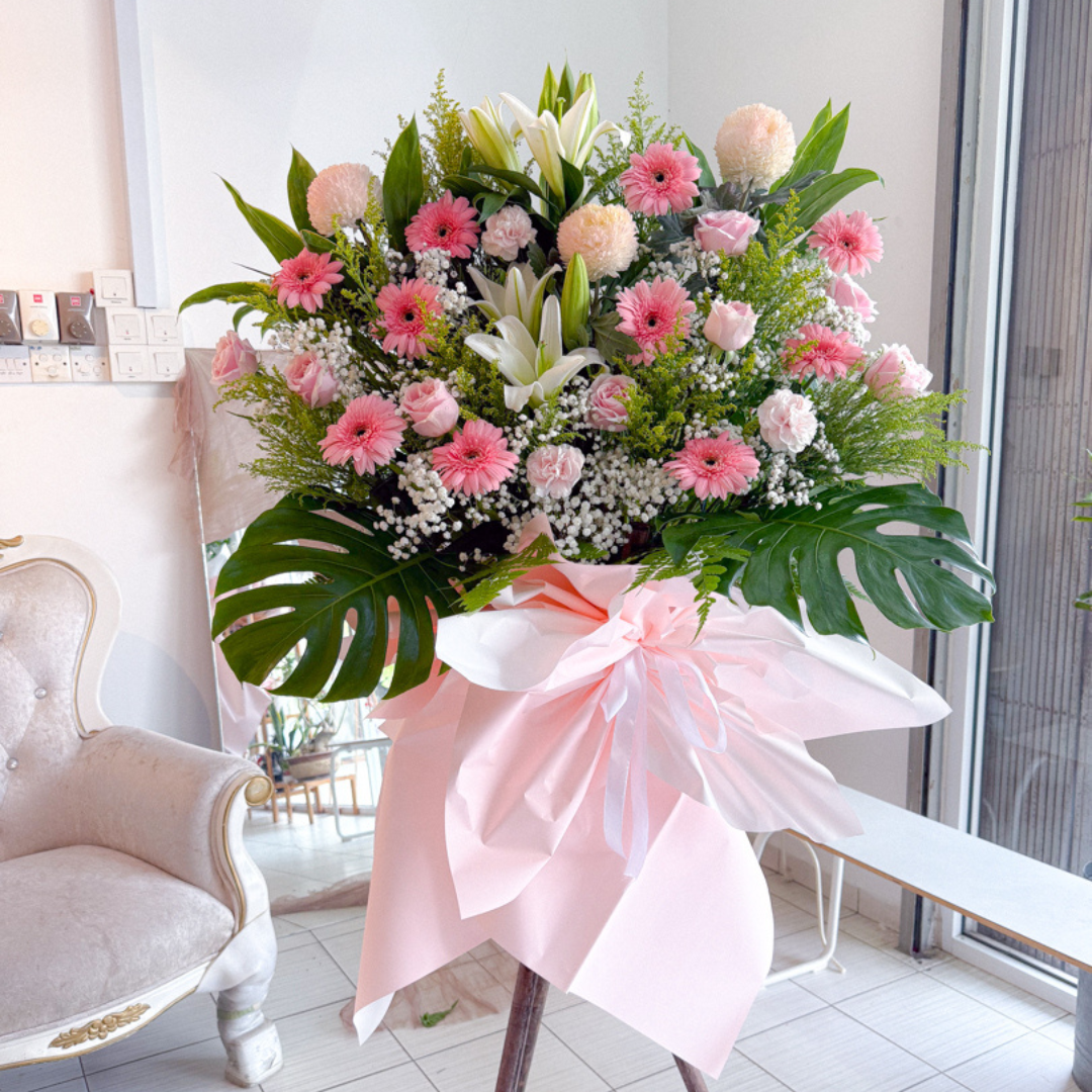 • Flower arrangement with Paper Mum (3 stalks), Lily White (2 stalks), Carnation Pink (3 stalks), Rose Pink (8 stalks), Gerbera Pink (10 stalks), filled with baby breath, peacock yellow and foliage