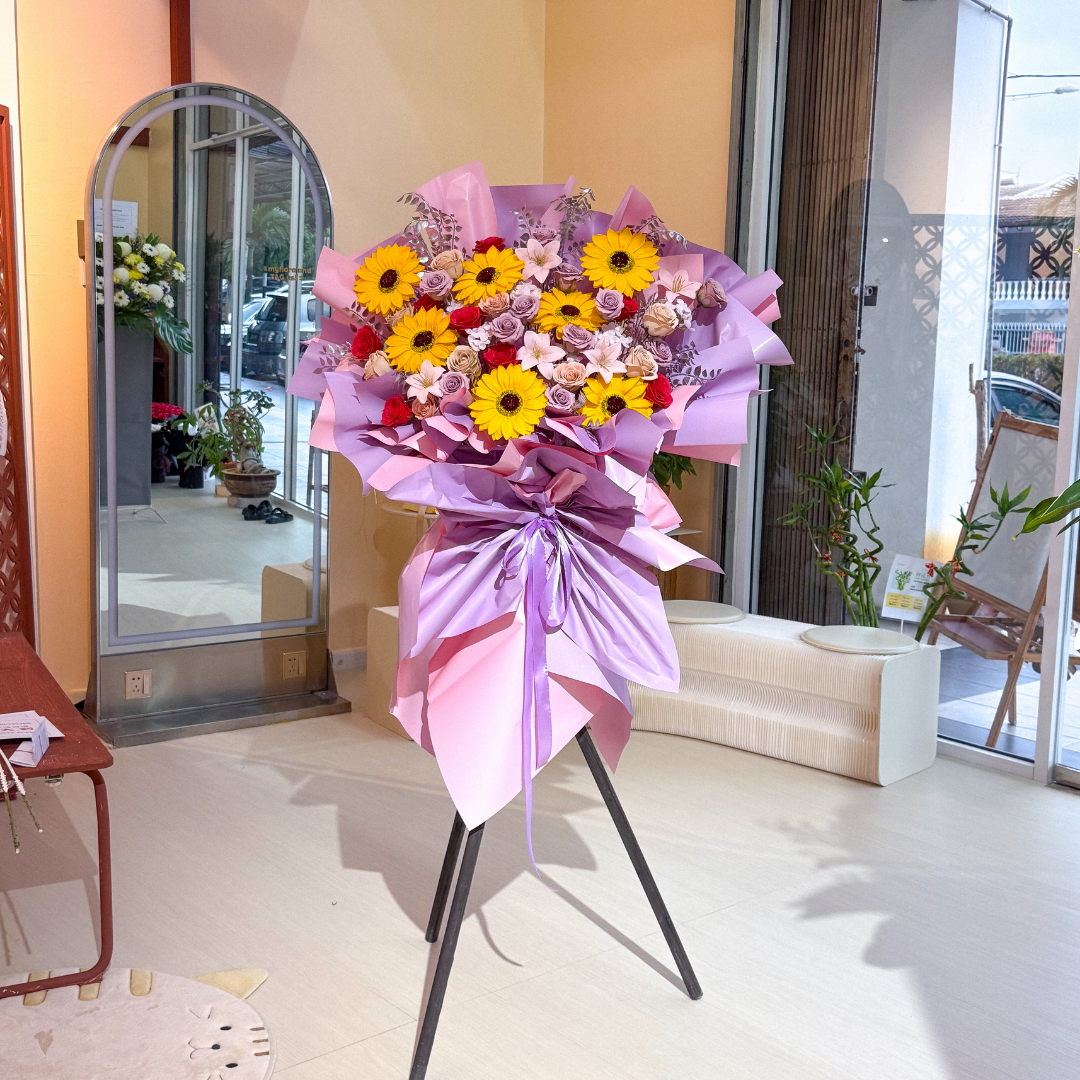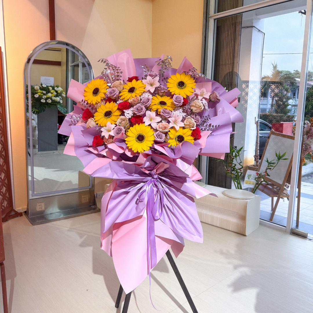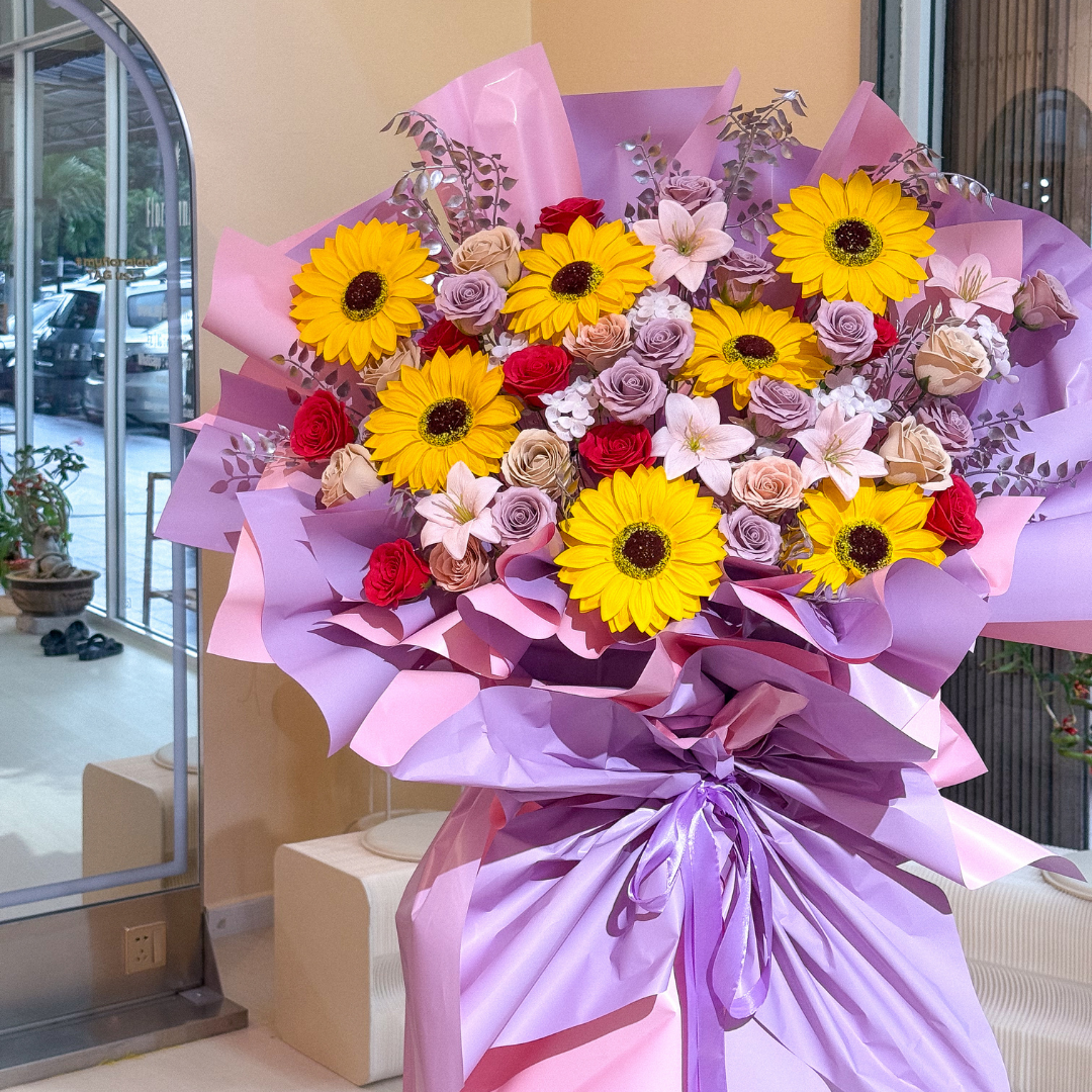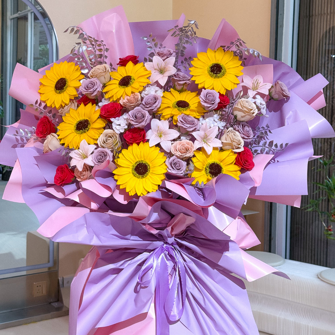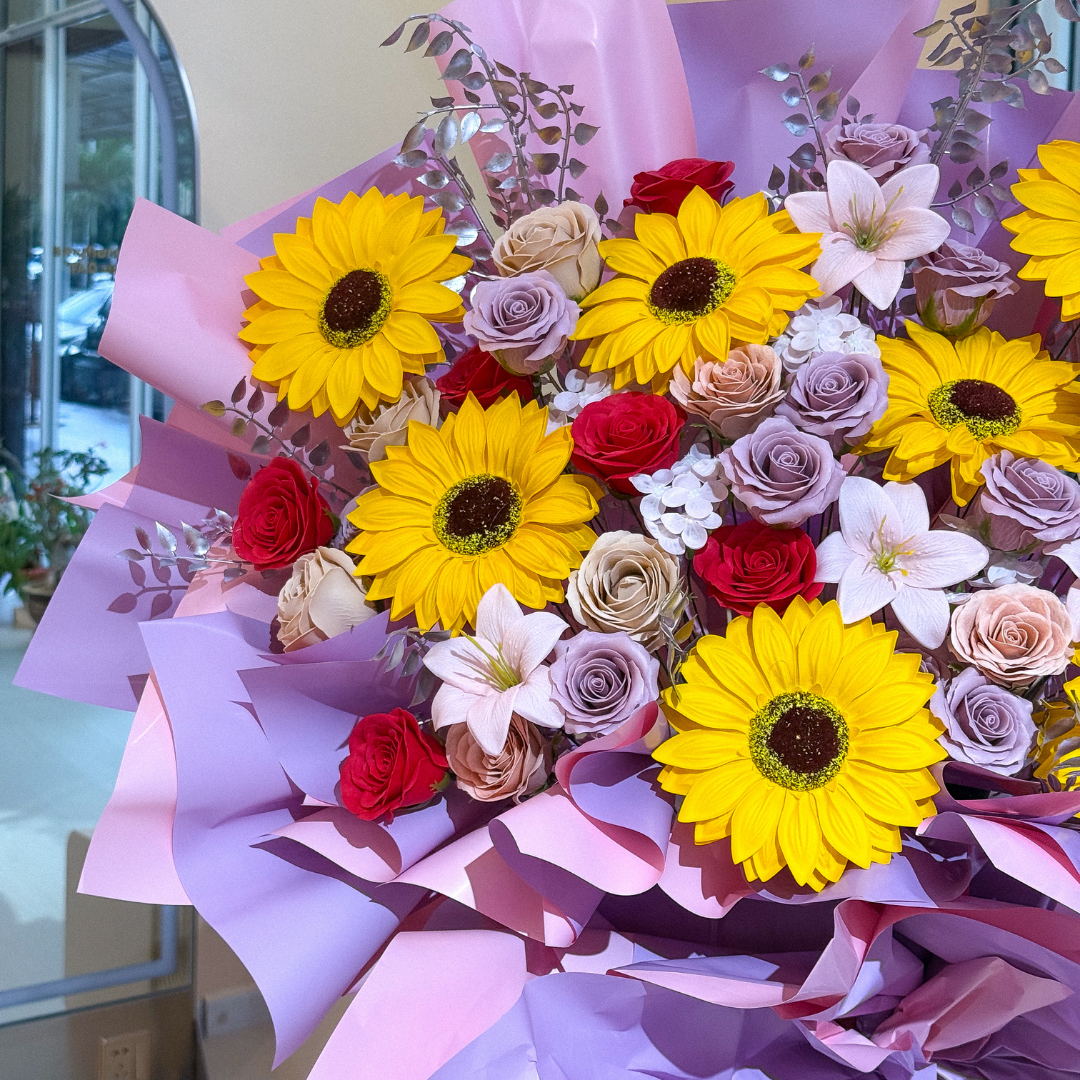• Flower included (Soap Artificial): Sunflower Yellow x7, Lily Light Pink x5, Rose Red x8, Rose Cappuccino x11 , Rose Toffee x9, filled with hydrangea and artificial silver leaf.