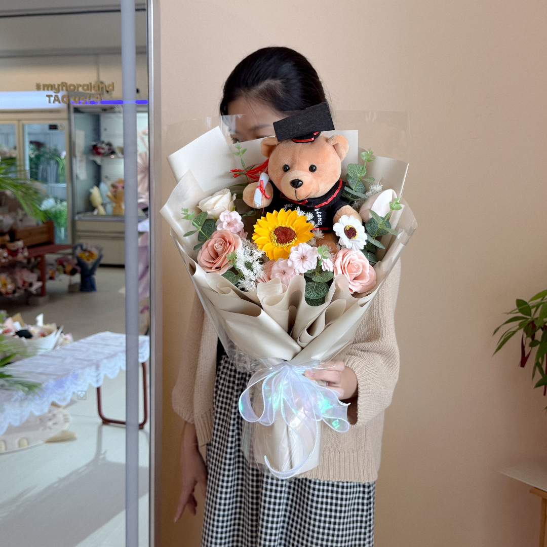 • Flower included: Mix Soap Flower, total 17 flowers. Combination Soap flower of Rose, Tulip, Mini Sunflower, Cherry Blossom filled with asparagus and cinera. Come with 20 cm graduation bear.