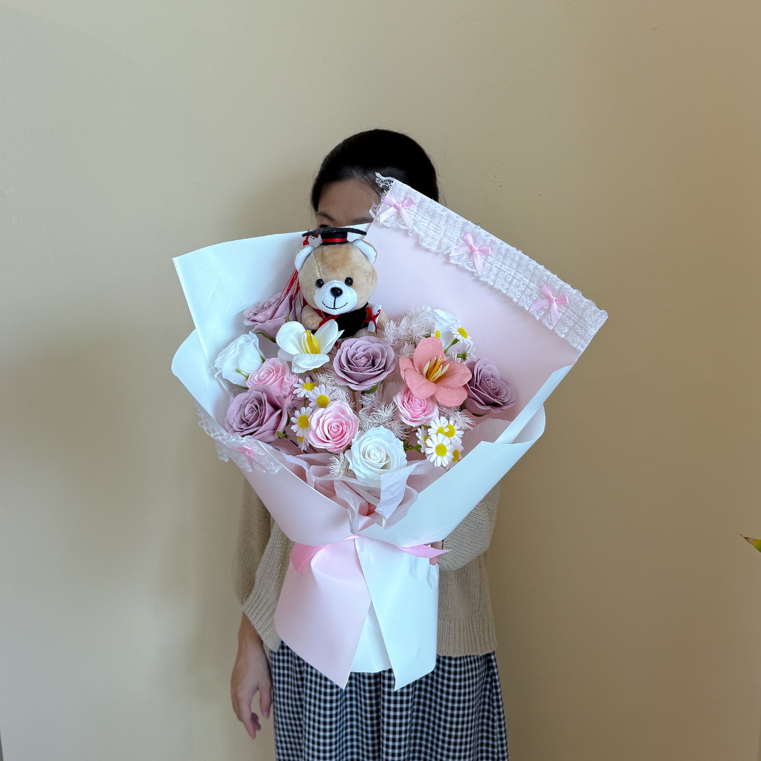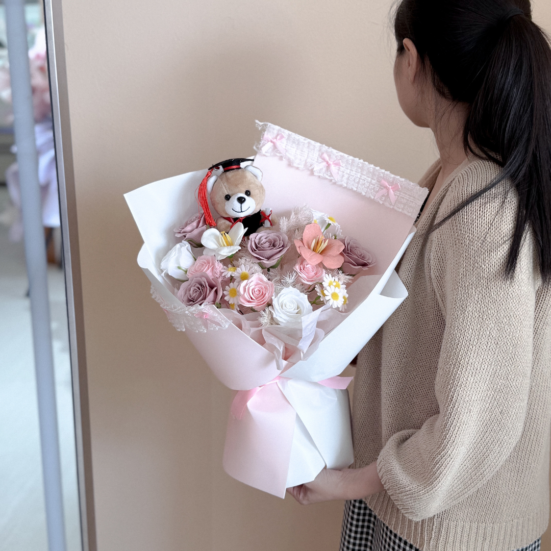 - Flower included: Mix Soap Flower, total 15 flowers. Combination Soap flower of Rose, Tulip, Chamomile, Asparagus. Come with graduation bear 11 cm (as show in picture)