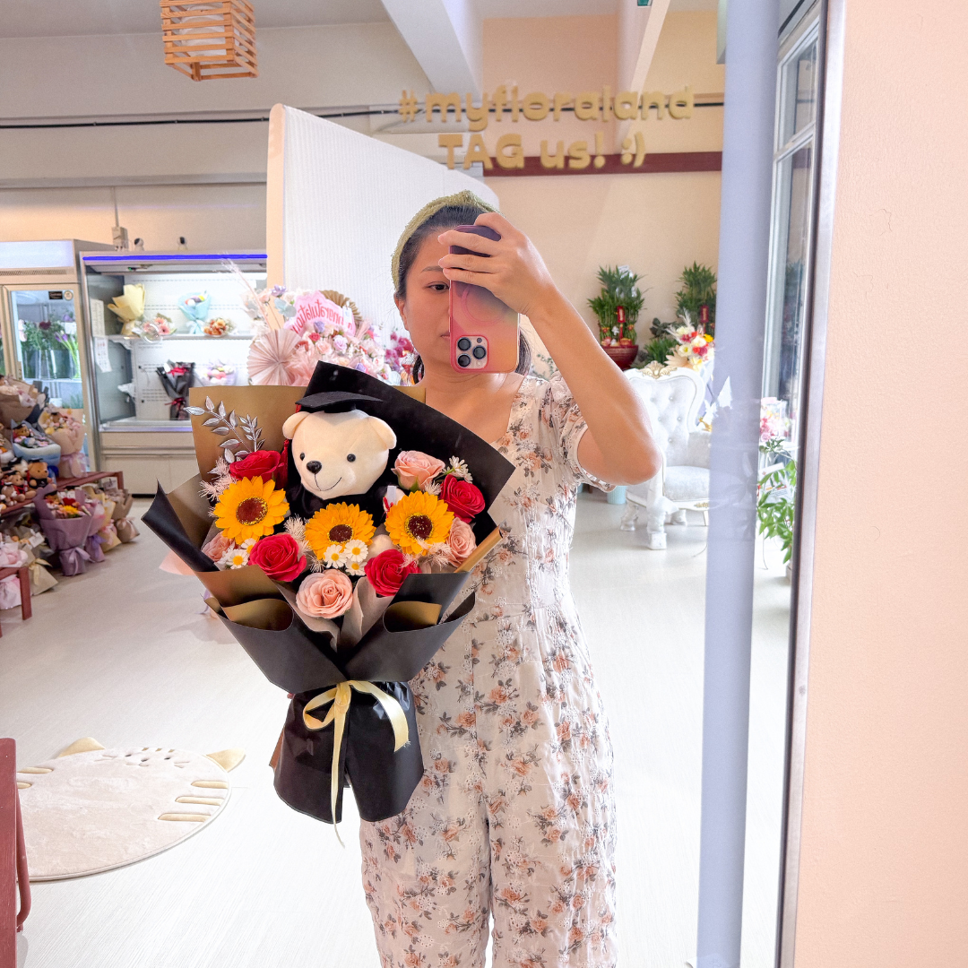 - Flower included (Soap Artificial): Mix Soap Flower of Rose x8, Sunflower x3, filled with chamomile, asparagus & silver leaf