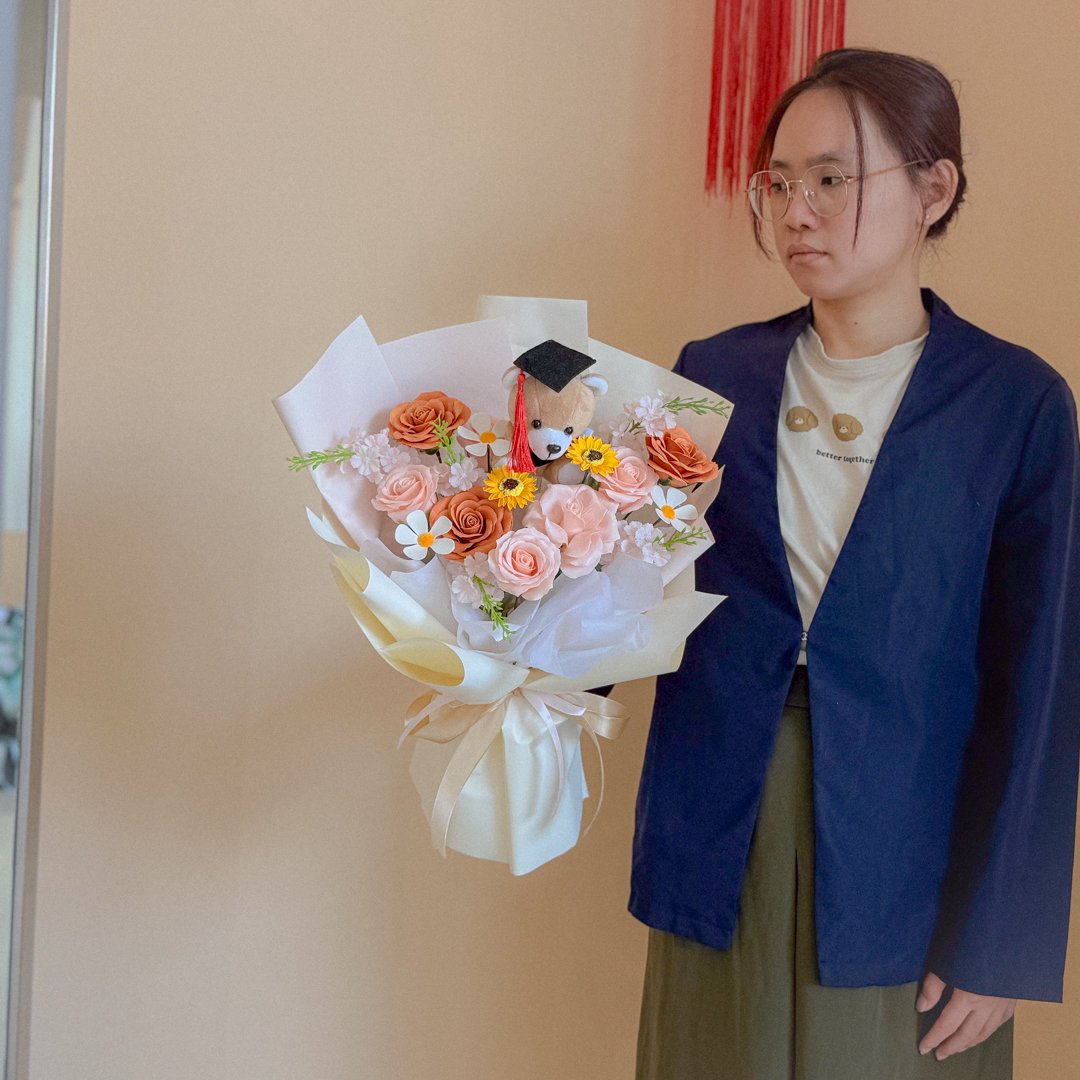 - Flower included (Soap Artificial): Mix Soap Flower, total 11 flowers. Combination of Rose (Sunset Orange, Apricot), Matholia Pink, Mini Sunflower Yellow and Soapbud. Come with a 15cm graduation bear (as show in picture).