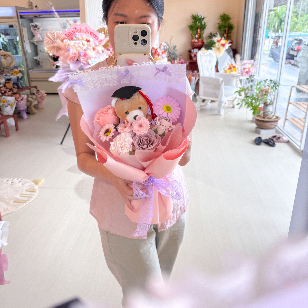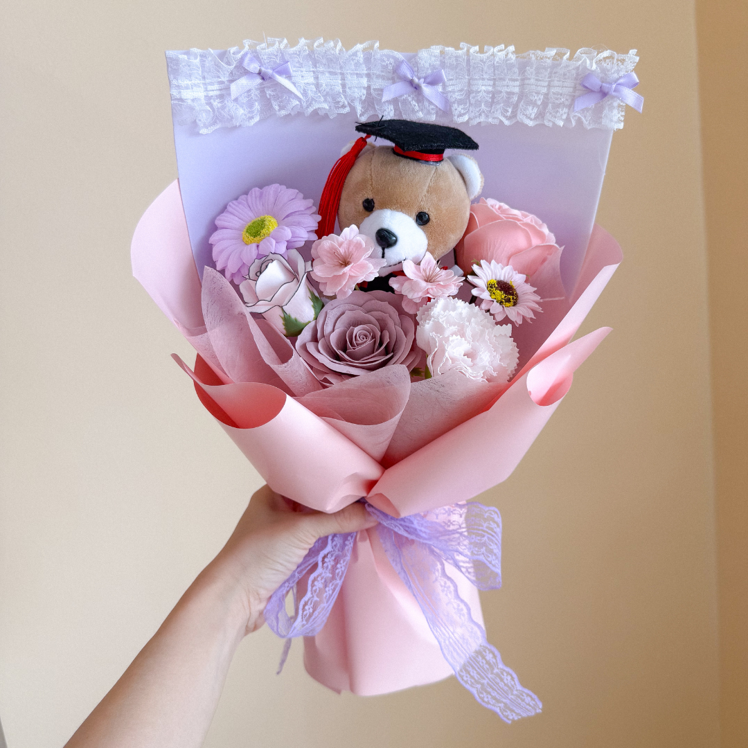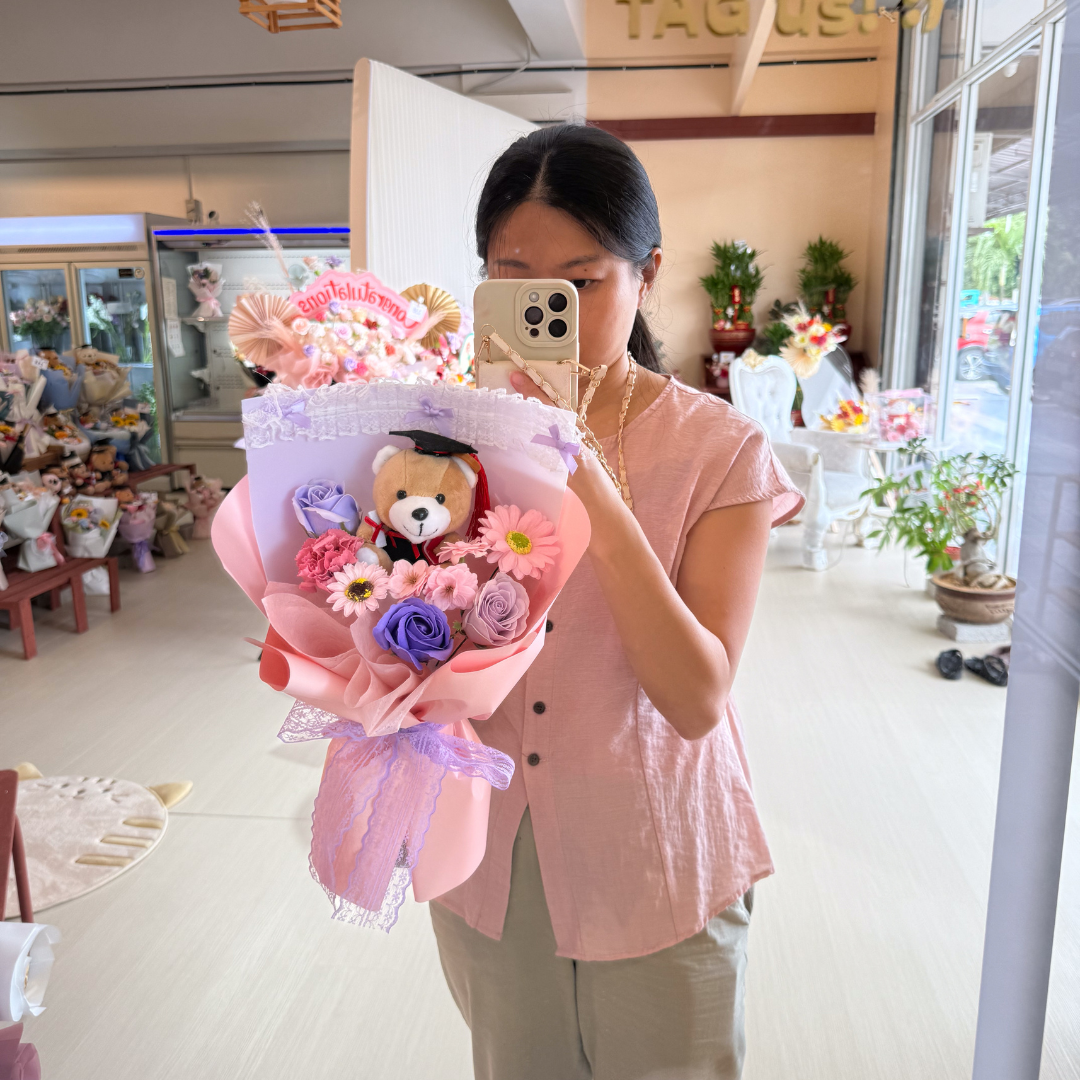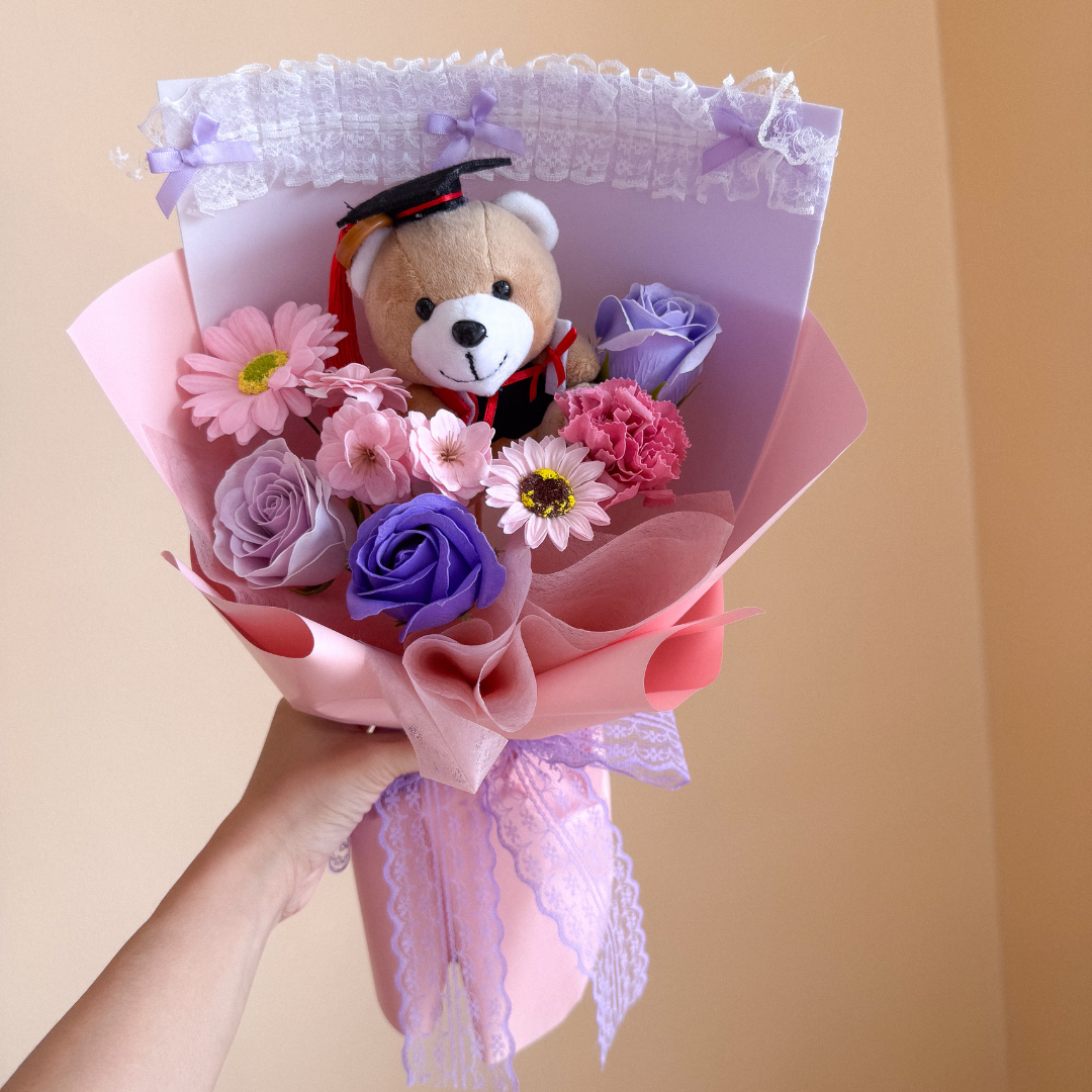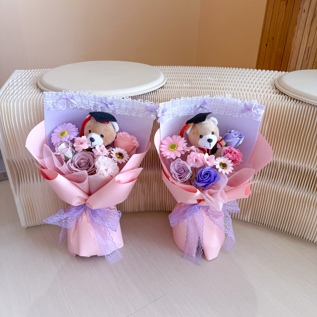 - Flower included (Soap Artificial): Mix Soap Flower of Rose x3, Sunflower x1,filled with small flower. Come with a 15cm bear (as show at the picture)