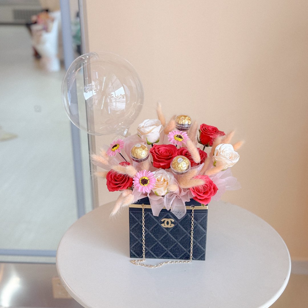 - Flower included (Soap Artificial): Mix Soap Flower of Rose Red x5, Rose Champagne x3, Mini Sunflower x3, Chocolate x3 filled with bunny tail. Come with a 15 cm Balloon. Wording can choose.