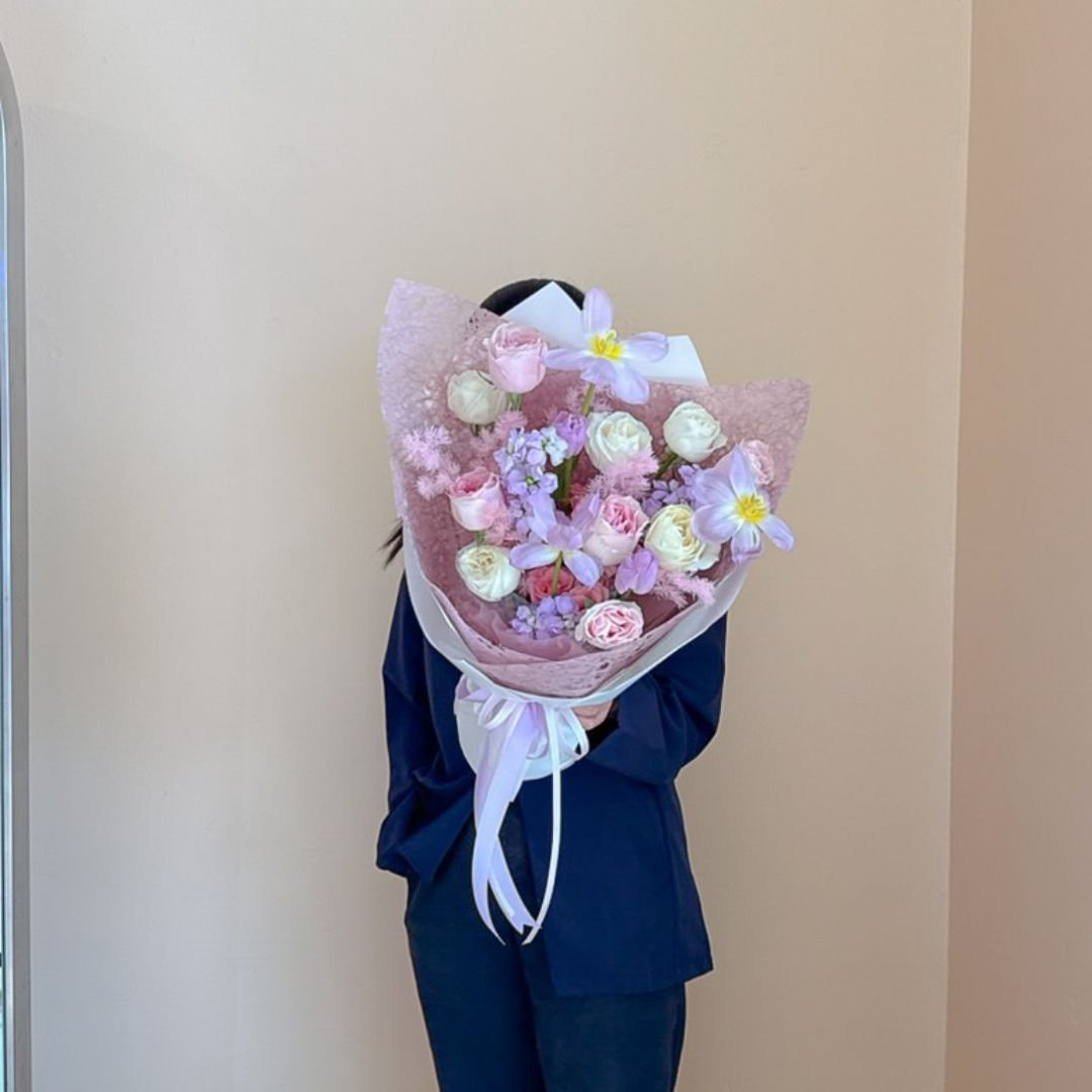 Large: Rose White (5 stalks), Rose Pink (4 stalks), Matholia (3 stalks), Tulip Purple (5 stalks) filled with spray rose pink & asparagus