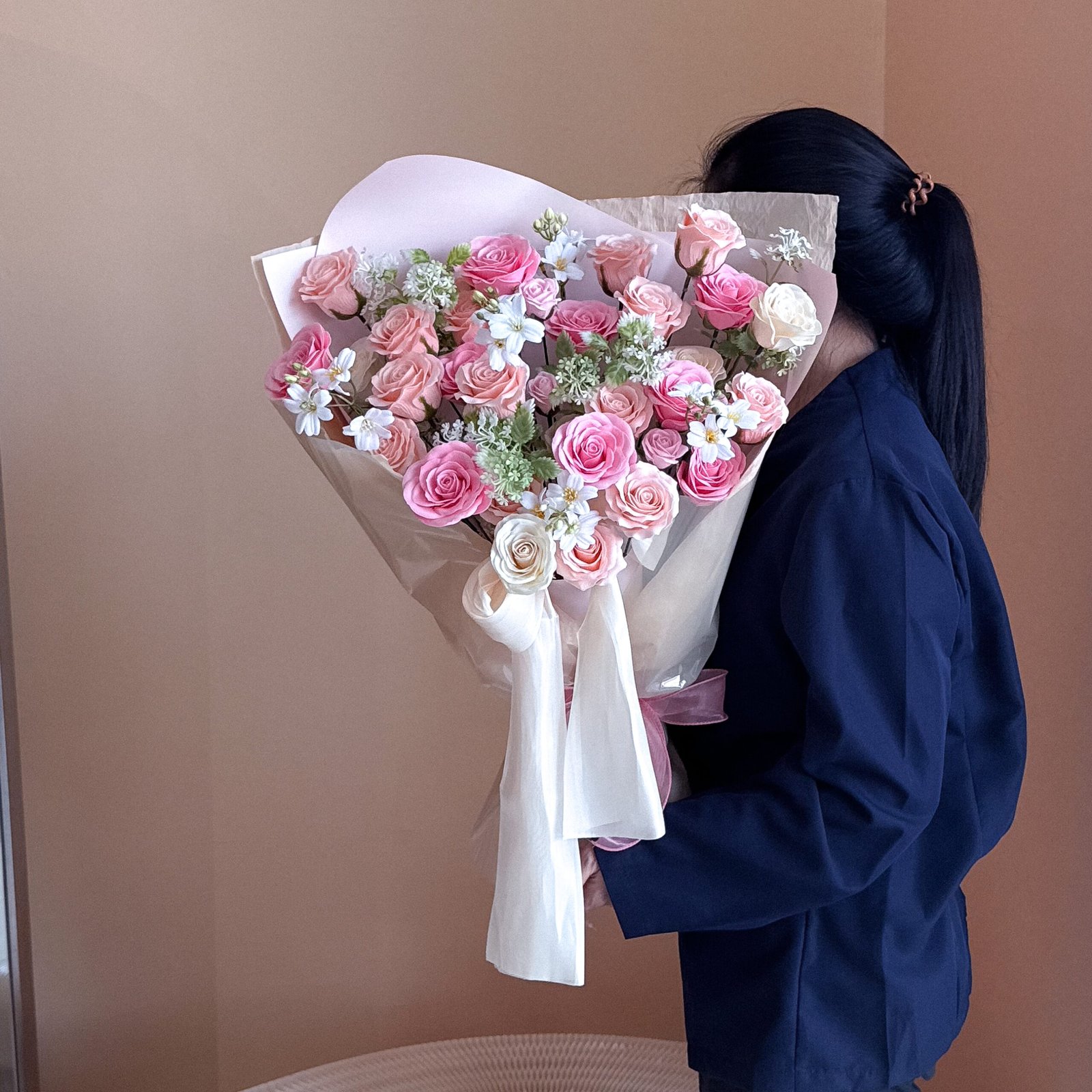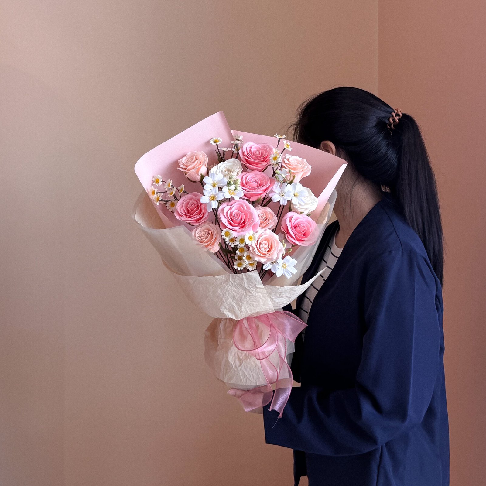 Standard: Mix Soap Flower, total 16 flowers. Combination of Rose (Watermelon Pink, Apricot, Sweet Almond) filled with small flower