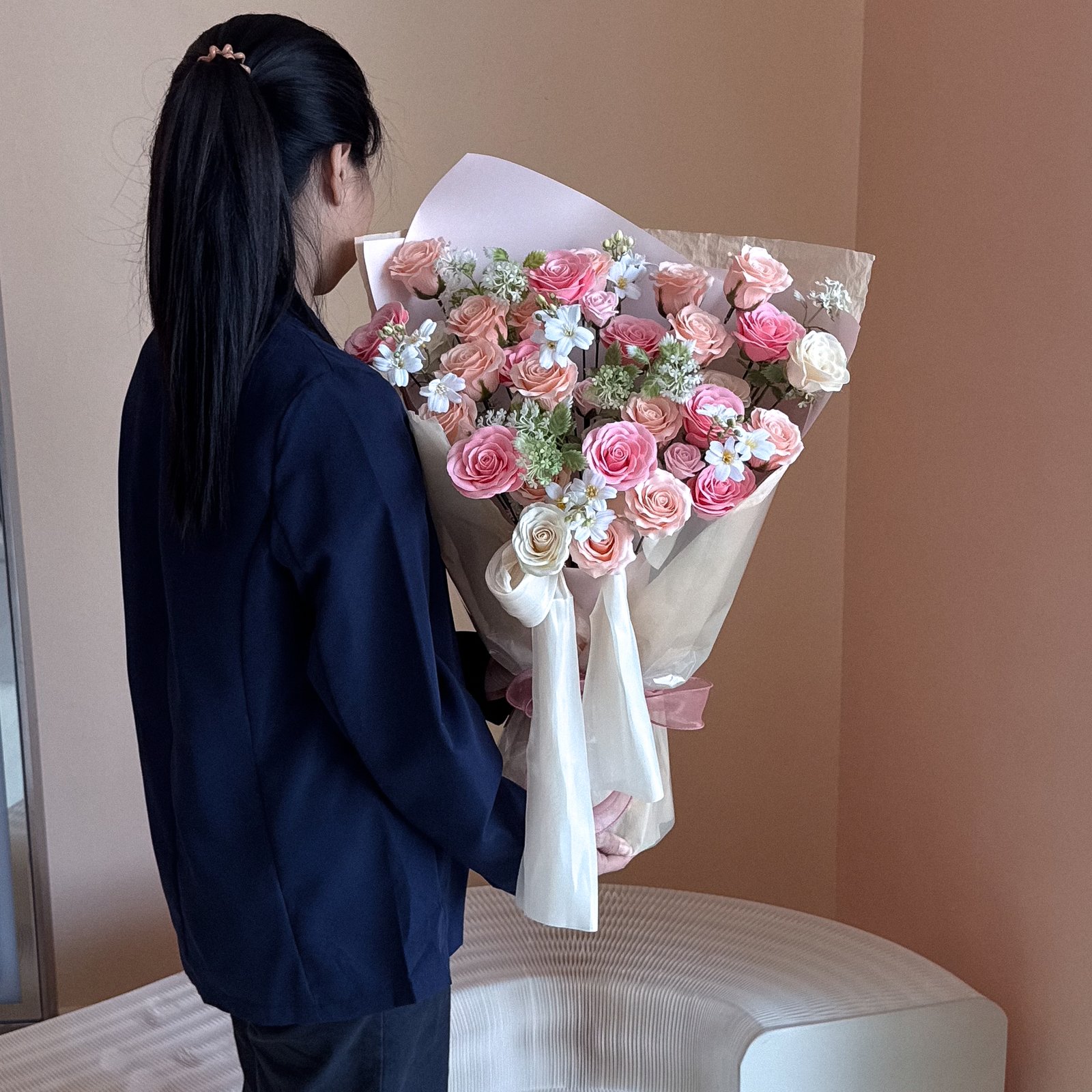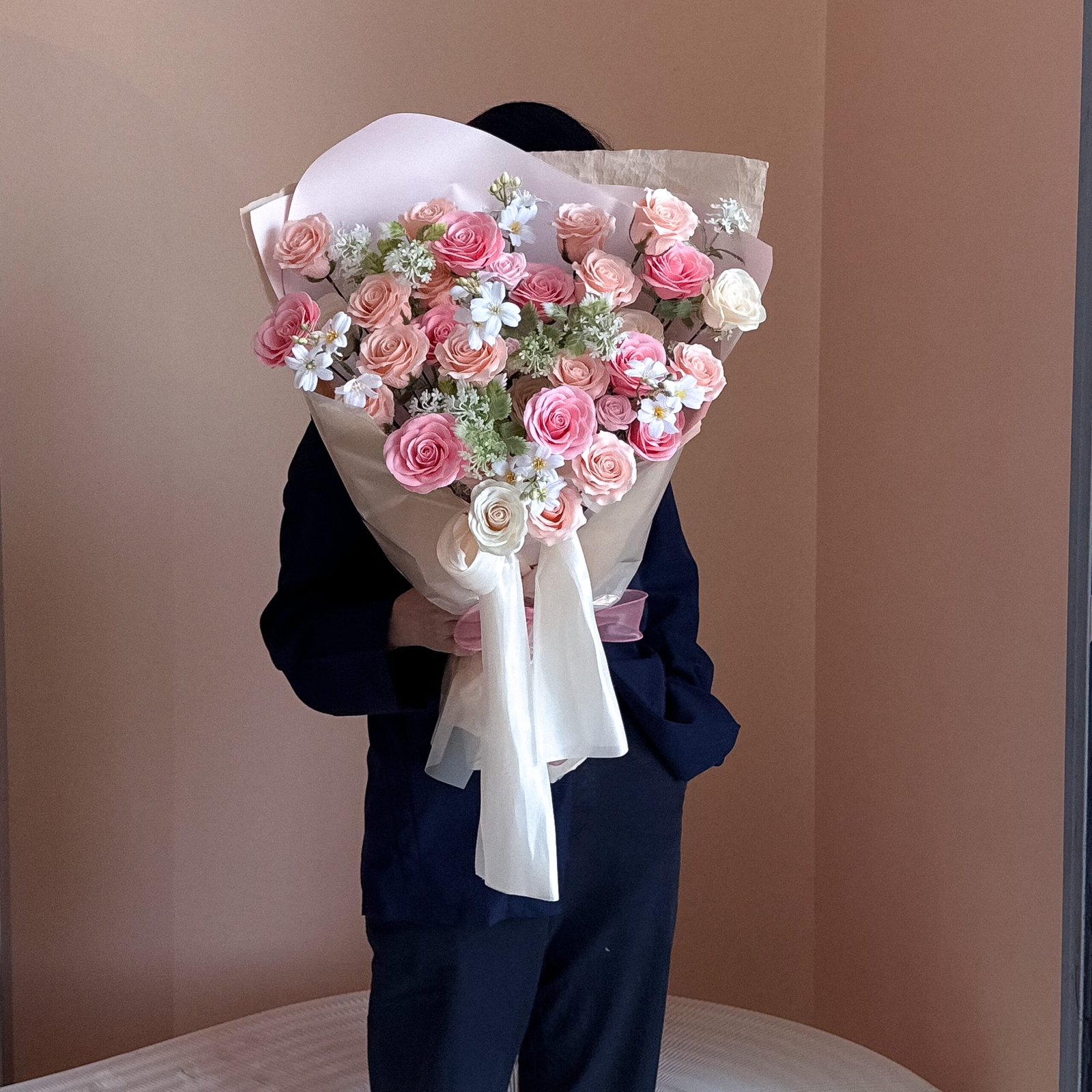 Large: Mix Soap Flower, total 38 flowers. Combination of Rose (Watermelon Pink, Apricot, Sweet Almond) filled with mini rose & small flower